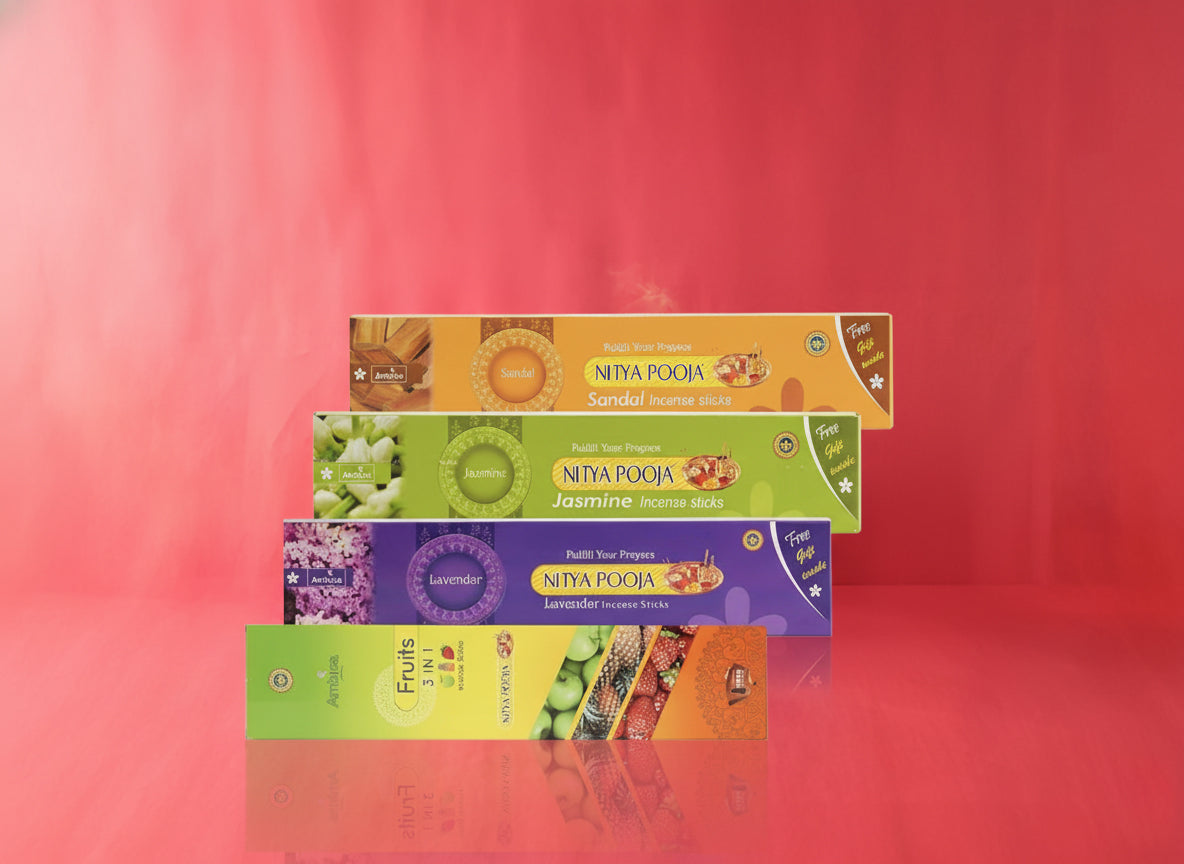 Ambica Nitya Pooja agarbattis leave a soothing and calming fragrance, perfect for daily rituals. In this combo of four fragrances - Sandal, Jasmine, Lavender, Fruits 3-in-1 - you will find the perfect fragrance for every occasion. Crafted using only the best ingredients, Nitya Pooja agarbatti sticks create a divine atmosphere with its relaxing scent, helping ease stress and promote peace. With over 75 years of expertise, Ambica ensures each stick is carefully handcrafted for a long-lasting, authentic experience. Ideal for aromatherapy, yoga, and spiritual ceremonies, these incense sticks add a touch of tranquillity to any space.